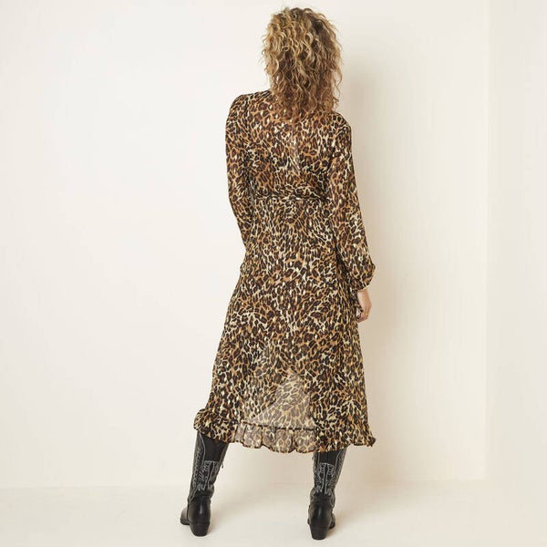 Jurk Flying Panther Long. Lange soepelvallende winterjurk met panterprint en gouden glitters. Heel leuk om te combineren met de Cardigan wrapped in het groen.