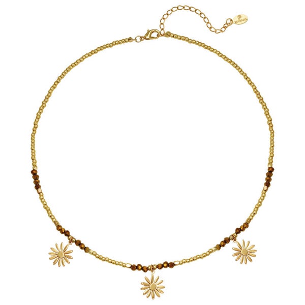 Schattige ketting met drie bloembedels en kleine kralen in verschillende kleuren. Heeft een bijpassende armband.