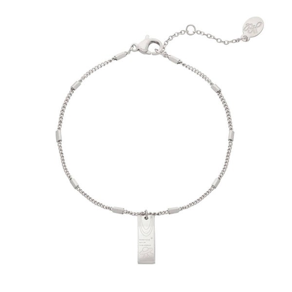 Stainless steel armband met een lange hanger. Deze hanger heeft een afbeelding van een planeet en een quote: Something out of this world.