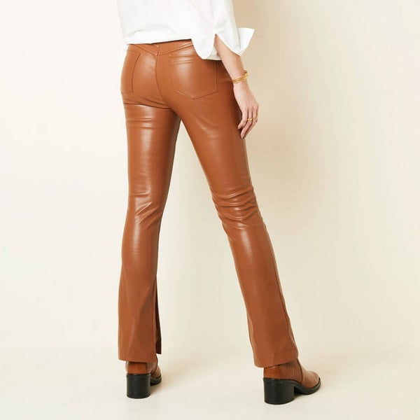 Broek in lederlook met split onderaan de pijpen. Te combineren met bijpassende blouse voor een pak in leerlook!