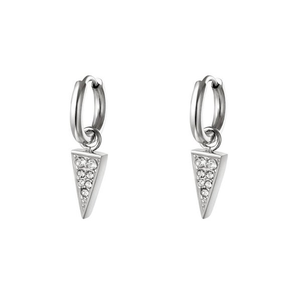 Oorbel van roestvrij staal met kleine driehoekige hangers. Hangers hebben een inleg van kleine zirkoonsteentjes.